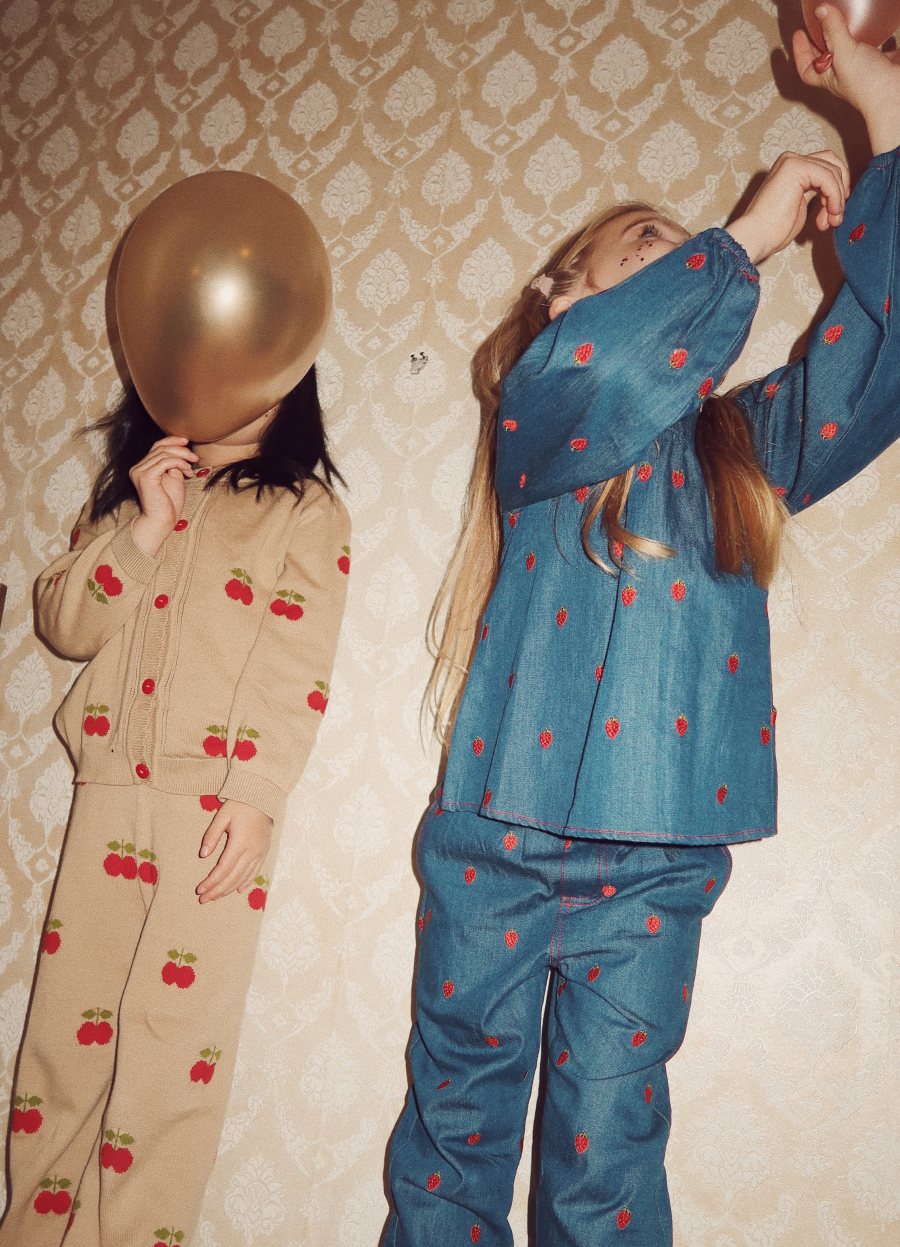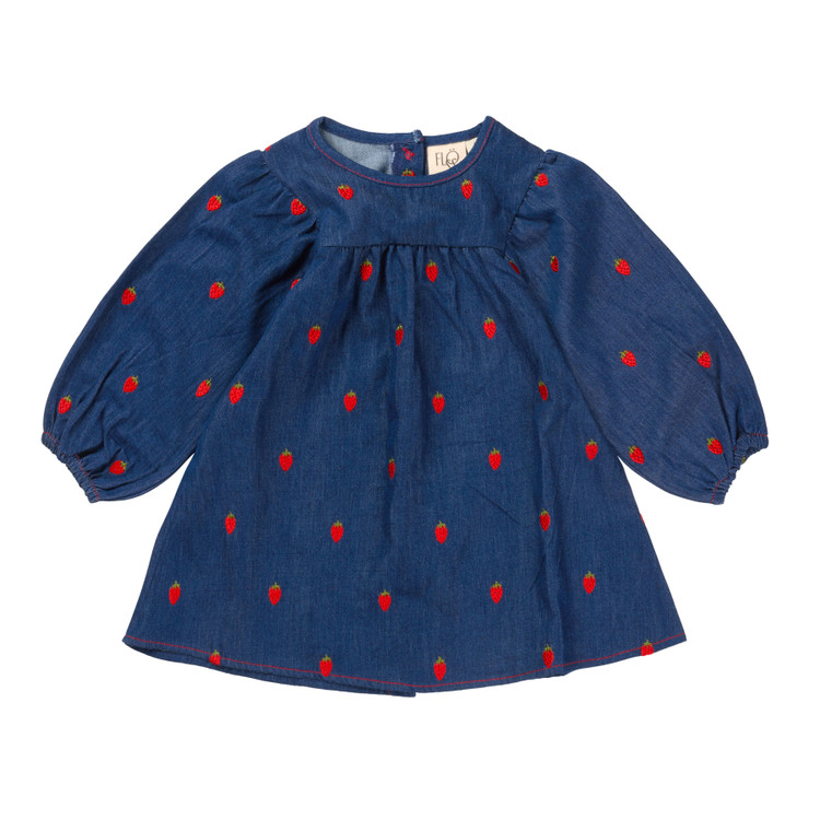Colette Dress in light woven denim, 100% organic cotton with all over small strawberries embroidery.
