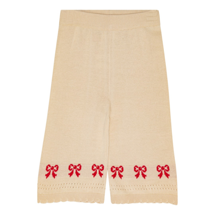 Rosie Pants is made of knitted soft cotton. Featuring elastic waistband, scalloped hem and red knitted bows.